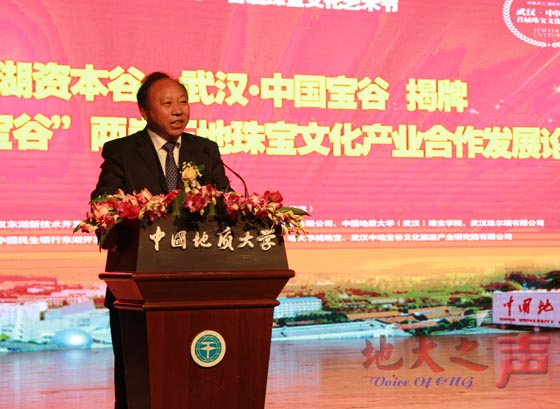 校长王焰新致欢迎辞。他说,推动“武汉·中国宝谷”建设,打造高端珠宝产业旅游文化基地,不仅有利于大大改善学校周边环境,同时也为提升学校珠宝学科影响力,加快珠宝学院“试点学院改革”,建设世界一流珠宝学院带来重大发展机遇;此外,对于促进学校相关学科发展,提升学校影响力与服务社会能力具有重要意义。他表示,学校将加强学科建设、提高人才培养质量,积极整合珠宝、材料、矿物学、矿床学、地球化学、检测设备与仪器、旅游、文化艺术和法律等相关学科和人才优势,加快推进珠宝科研大楼建设,搭建各类珠宝旅游文化交流平台,广泛集聚人才、科技和产业资源,认真落实与武汉市政府签署的共建“武汉·中国宝谷”协议的各项责任,积极策划、参与“武汉·中国宝谷”建设的重大项目。