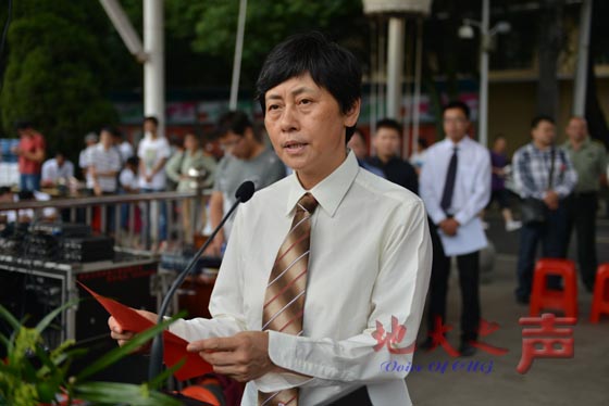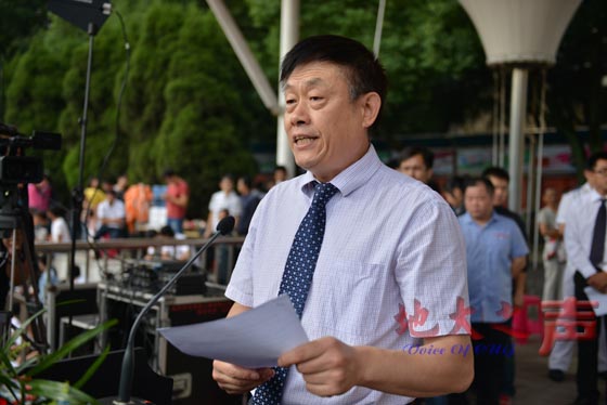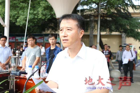 王焰新讲话。他首先为承训教官的辛勤付出,为新生精彩的表现和即将开启的求学之路点赞和喝彩。他说,建校62年来,学校为国育才、英雄辈出,一批批科技精英、治国雄才、商界骄子和体育健儿,为祖国的建设和发展做出了重要贡献,新一代地大人为这个大家庭融入新的血液,带来新的生机与希望。他将“养浩然正气,积真才实学”这十个字送给新生,并用自己30年前刻骨铭心的求学岁月来劝诫新一代地大人:“养浩然正气,需明辨是非,敢于担当,自律自省;积真才实学,需扩展视野,习惯选择,持之以恒。”他祝愿新一代地大人:埋头练真功,挺胸走正道,为自己、为国家谱写一段精彩的青春华章!