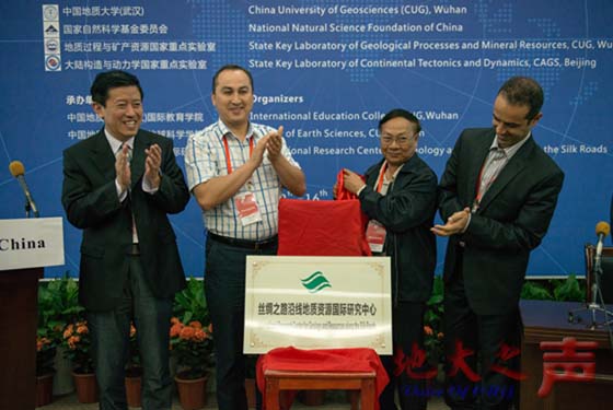 郝翔、塔吉克斯坦国立大学副校长Bakhtovar Safarov、伊朗德黑兰大学Hassan Mirnejad教授、泰国苏兰拉里理工大学Kriangkrai Trisarn教授共同为“丝绸之路沿线地质资源国际研究中心”揭牌。