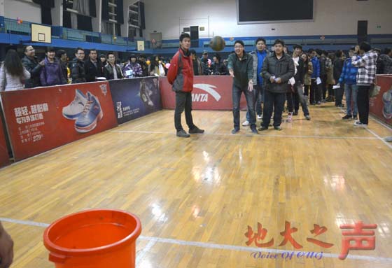与晚会同时进行的是体育嘉年华和“快乐一三一四”游园活动。体育嘉年华从晚上7点开始,到零点结束,由体育课部承办。活动丰富有趣,其中有体现地大特色的“壁虎漫步”攀岩竞赛,还有“排球掷准”、“毽球”、“定点投篮”、“网式头顶气球”、“夹球障碍跑”、“跃动新年”、“瞄准射击”、“珠行万里”、“足球保龄球”、“雷区取水”等活动。几乎每个区域入口处都排起了长队,特别是在“壁虎漫步”活动现场,在造型丰富的抱石墙前,两条长队蜿蜒曲折,作为速度赛道的抱石墙,接近90度,两个同学分别抓着绳索正奋力向上攀爬。体育嘉年华负责人、体育课部郭鹏同学说:“我们这次活动准备了一个月,在场地布置和现场音乐上都有一些创新,这样大家才能玩的更轻松些。”