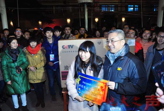 最终,来自经济管理学院的2012级唐慧敏同学幸运获得价值6000元的液晶电视这一大奖,王焰新为唐慧敏颁发了奖品和获奖纪念证书,证书上有校党委书记郝翔、校长王焰新的亲笔签名。