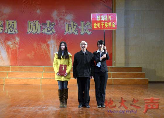 殷鸿福院士为李四光奖学金、杨遵仪奖学金、冯景兰奖学金、郝诒纯奖学金、赵鹏大奖学金、殷鸿福与金钉子奖学金的获奖学生代表颁奖。