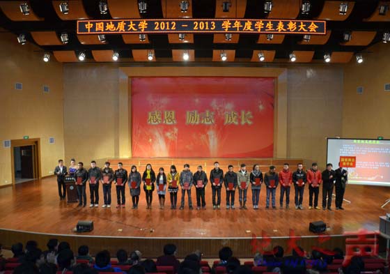 (通讯员高艳丽 赵海涛 孟文钱 摄影周阳 周子豪)12月30日晚,我校2012-2013学年度学生表彰大会在北区音乐厅举行。中科院院士殷鸿福,校党委书记郝翔,校党委副书记朱勤文、傅安洲,学校相关职能部门负责人、各学院党委副书记和学生代表出席了表彰大会。