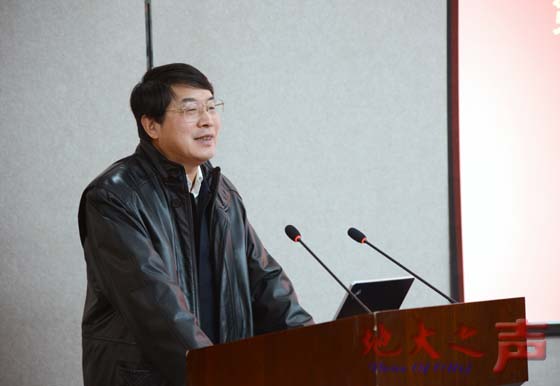 东湖新技术开发区管委会副主任、武汉未来科技城建设管理办公室主任宋治平讲话。他说,武汉市和地大联合建立武汉资环工研院,是实施依靠科技驱动,提升科技成果转化能力,促进产业升级的一项重要举措,此次理事会的召开标志着资环工研院的建设和发展又迈入了一个新阶段。他表示,东湖高新区和未来科技城对工研院今后的建设和发展将给予全心的支持。