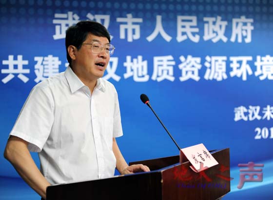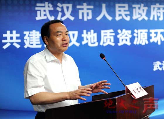 唐良智讲话。他指出,科教资源是武汉的重要特质和财富,充分利用好科技、教育、人才资源,使之转化为现实生产力,是武汉当前实现跨越发展和转型发展的重要使命。武汉将以在汉高校优势学科为依托,陆续共建系列工业技术研究院,充分发挥科技第一生产力的作用,共推东湖国家自主创新示范区发展,实现武汉建设国家中心城市的国家使命。他认为,在市场的环境下,大学教师有愿望、有激情、有使命把科技资源优势转化为现实生产力,政府应当为他们创造鼓励创新、宽容失败的环境,鼓励他们进一步解放思想,提升竞争力。他表示,地大在地质资源环境领域具有独特优势,学校具有“攀高登峰”的精神,这种精神已经变成广大师生的精神基因。他希望地大师生发扬“攀高登峰”的精神,按照市场主导的原则,推进企业运作的方式,大力推动科技创新、实现从知识链到产业链的转化,在促进区域经济社会发展中取得丰硕的成果,为武汉市区域经济的强势发展做出新的贡献。