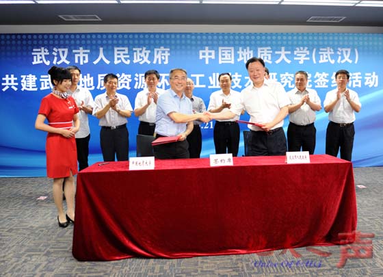 (记者曹南燕 徐燕)6月21日,我校与武汉市人民政府共建“武汉地质资源环境工业技术研究院”签约活动在武汉未来科技城举行。武汉市市长唐良智,市委常委冯记春,副市长邢早忠,市政协副主席、东湖高新区管委会主任张文彤,市政府秘书长郭胜伟,中科院院士殷鸿福,校党委书记郝翔、校长王焰新,校党委副书记朱勤文、傅安洲,副校长郝芳、王华、万清祥出席了签约活动。