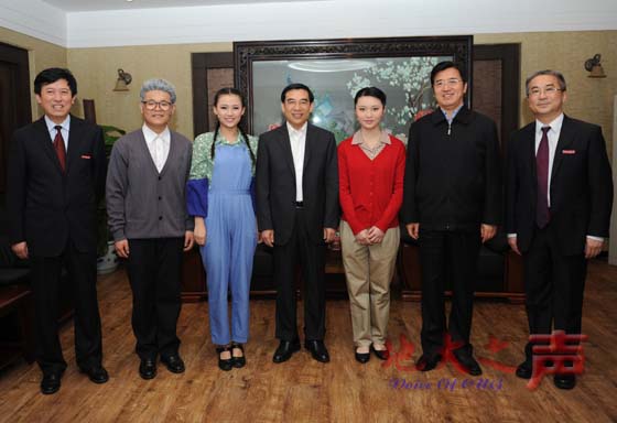 王安顺(右四)、杜玉波(右二)等演出前与校领导和学生演员代表合影。