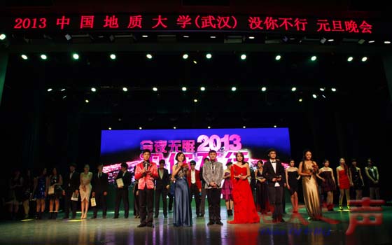 整场晚会以广播台的歌舞表演《冬天里的一把火》开场,演员们酷酷的妆容、飘逸的舞姿引发了全场观众的热情。随后,主持人社的《你的新闻我联播》小品,带着大家穿越了三生三世,见证了白娘子和许仙的爱情。受广大师生热捧的话剧《大地之光》的主要演职人员来到现场,在剧中饰演李四光的资源学院学生赵新雅、饰演田雅坤的数理学院学生张津等演员一一为现场师生送上祝福。而由研究生带来的舞蹈《LOVE STORY》以其可爱、搞笑的动作掀起了全场第一个高潮。说唱节目《BLACK AND YELLOW》,表演者就地取材,将学生的生活故事编进歌曲中,引起了很多同学的共鸣。而最后一个节目《DAY DREAM》由模特队带来,不同于以往的模特走秀,它将走秀与舞台剧结合起来,帅哥靓女一起大跳骑马舞,在神曲《江南style》的音乐中,整场晚会画上了一个完美的句号。