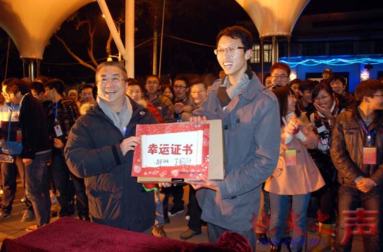 校长王焰新颁发“新年幸运第一人”奖。同2012年一样,今年同样设置了抽取我校“新年幸运第一人”的环节,大家都期待不已。零点升旗仪式之后,校长王焰新在同学们欢呼声中按下按钮,电子屏上不停翻滚着的学生学号瞬间静止,幸运定格在环境学院2011级学生李成林身上。在现场学生欢呼声中,李成林走上主席台,从校长王焰新手中接过带有校党委书记郝翔和校长王焰新亲笔签名的幸运证书和幸运奖品——一台价值6000元的联想笔记本电脑。