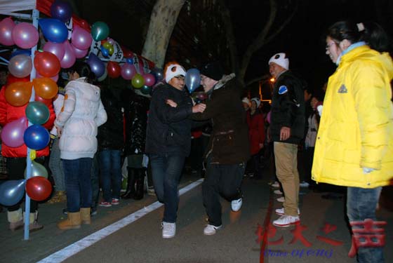 百人骑马舞带动全场一起high起来。在冬日寒气逼人的夜晚,现场的氛围却欢腾不已,不断升温。伴着《江南style》的音乐节奏,现场学生共同参与的骑马舞引爆现场,舞台周围的几百名同学情不自已,纷纷冲向舞台中央跳起来;刚劲有力的武术表演集棍棒、剑、双节棍等多种表现形式,迅速成为舞台中央的焦点;国防生神情坚定、步伐整齐的表演同样令现场的同学肃穆、振奋;校舞龙队的表演让现场所有人眼前一亮,在时而喜庆时而青春活泼时而舒缓的音乐背景下舞龙队队员们表演卖力,或奔跑跳跃,或卧地弹动,为大家呈现出两条活灵活现的游龙,场内欢呼鼓掌声经久不息。