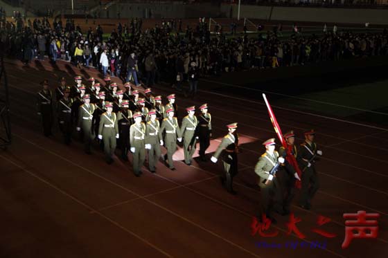 地大师生在国歌声中迎来新年。零点升国旗仪式是元旦嘉年华的高潮,也是地大学生表达新年祝愿的一种方式,现场1万余名学生自发聚集在国旗台周围,表达对祖国、对学校的祝福。军乐团雄壮的国歌在场地中央响起,全体师生肃穆而立,面向升旗台,凝视着节日灯光映照下缓缓升起的五星红旗。在大家的共同期盼下,2013第一次升旗仪式顺利举行。