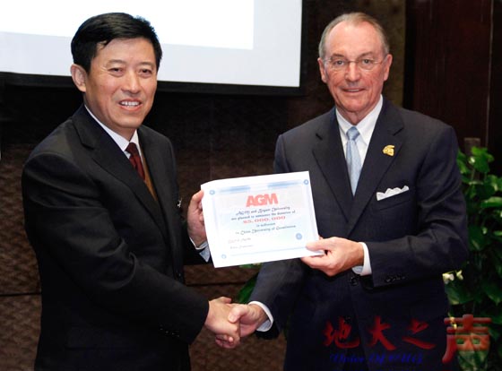 梅恪礼讲话。他说,在过去十几年,双方建立了友好的合作关系,布莱恩特大学与我校的合作交流改变了美国老师和学生对中国的看法,使双方互相理解,互相支持,共同发展。他希望,我校能用该软件发现更多的石油,培养更多的专业人才。