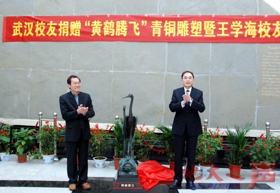 11月2日上午,武汉校友向我校捐赠“黄鹤腾飞”青铜雕像及王学海校友捐赠仪式在逸夫博物馆一楼大厅举行。校领导王焰新、傅安洲、赖旭龙、万清祥,校教育基金会理事长张锦高,武汉市副市长胡立山、武汉市政协副主席张文彤、武汉人福医药集团股份公司有关负责人,武汉校友,我校相关职能部门负责人参加了捐赠仪式。