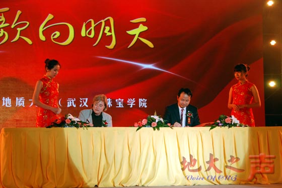 副校长万清祥代表我校与武汉腾建达商贸有限公司董事长张斌签署了珠宝科研大楼投资建设项目协议书,珠宝学院院长杨明星与美国宝石学院主席Donna Baker签订了珠宝学院与美国宝石学院教育合作项目协议书。