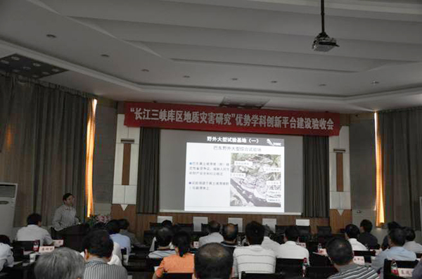 校党委书记郝翔代表学校致欢迎辞。验收专家组组长王思敬院士主持验收。“三峡平台”建设项目负责人唐辉明教授分别从“项目概况;子项目建设目标和任务完成情况;平台主要建设成效;建设资金到位及执行情况;项目在管理体制和运行机制方面的探索和创新;建设经验、存在的主要问题及下一步建设的设想”等几个方面进行了汇报,并播放了“三峡平台”建设项目的专题片。验收专家组听取汇报后,查阅了相关资料,经质询和讨论,形成了验收意见,最后一致同意通过验收,建议教育部继续支持该平台建设。