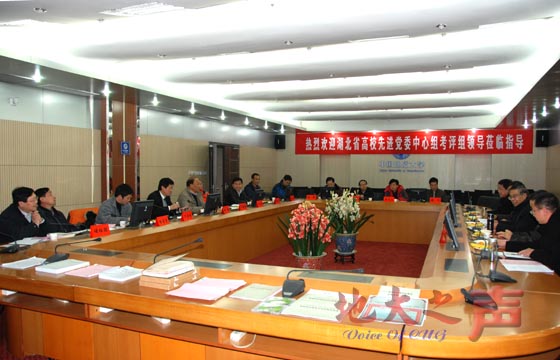 12月7日下午,以湖北省教育厅原副巡视员、武汉生物工程学院党委副书记高长舒为组长的省高校先进党委中心组考评组一行五人来校,对学校党委中心组学习情况进行检查考评。校党委书记郝翔、党委副书记丁振国,部分二级党组织书记和相关单位主要负责人参加了检查汇报会。