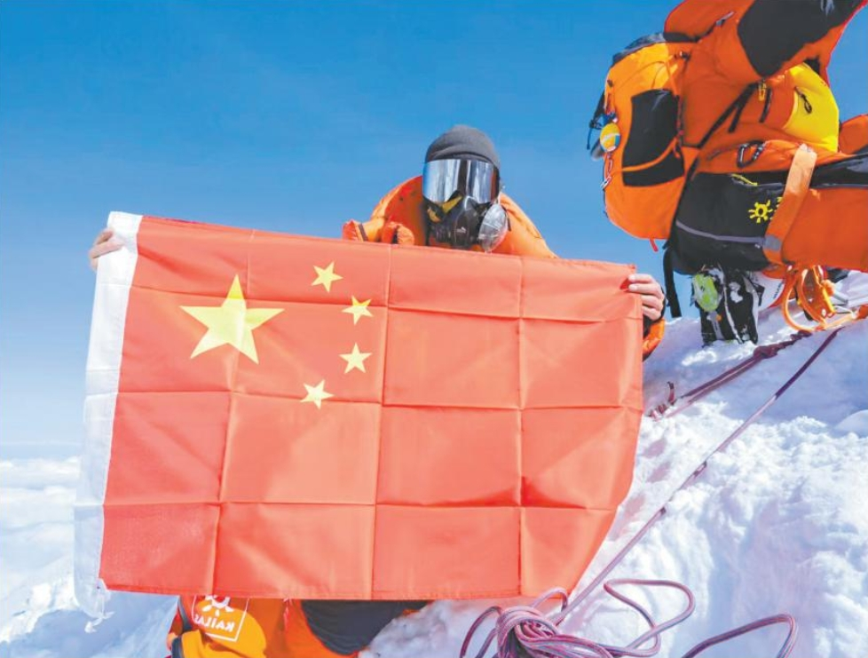 周千龙登顶珠峰展示五星红旗。